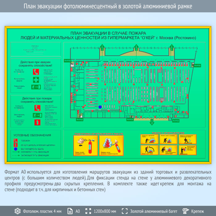 План эвакуации фотолюминесцентный в золотой алюминиевой рамке (А0 формат) в Москве купить