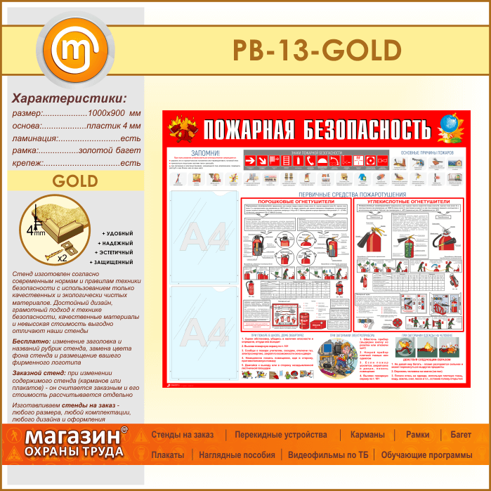 Стенд «Пожарная безопасность» с 2 карманами (PB-13-GOLD) в Москве купить