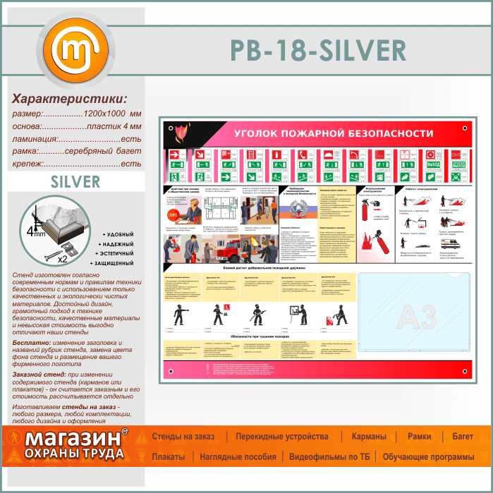Стенд «Уголок пожарной безопасности» с карманом А3 формата (PB-18-SILVER) в Москве купить