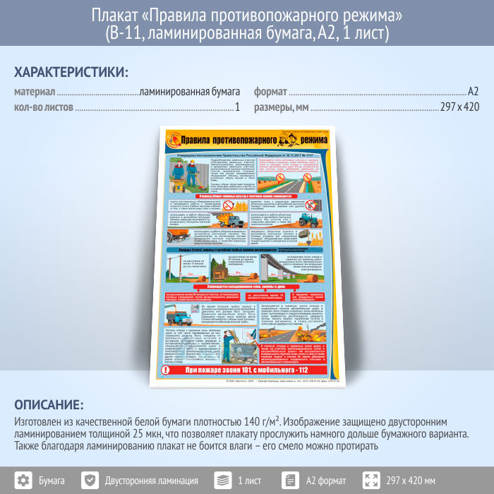 Плакат «Правила противопожарного режима» (В-11, ламинированная бумага, А2, 1 лист) в Москве купить