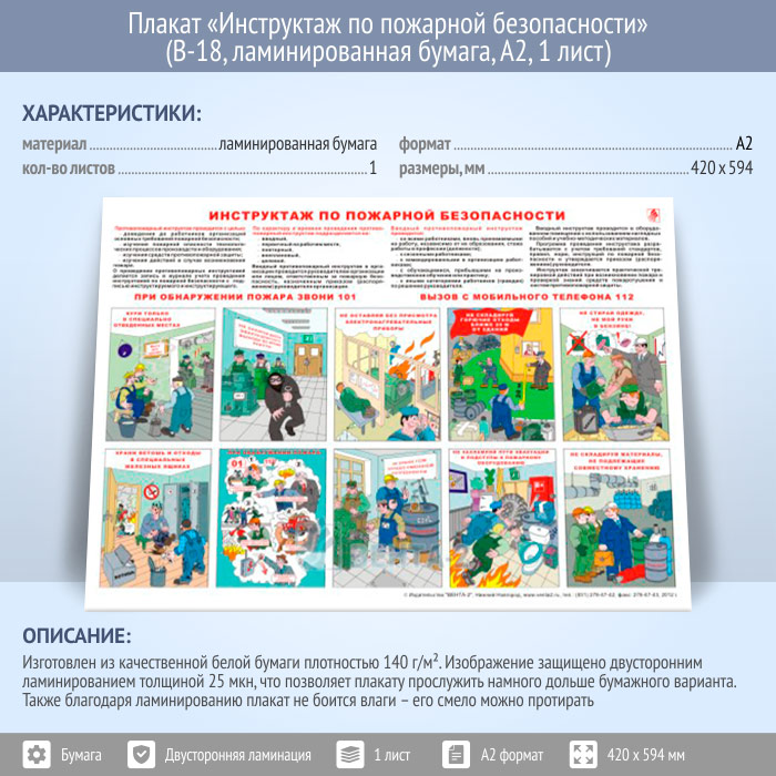 Плакат «Инструктаж по пожарной безопасности» (В-18, ламинированная бумага, А2, 1 лист) в Москве купить