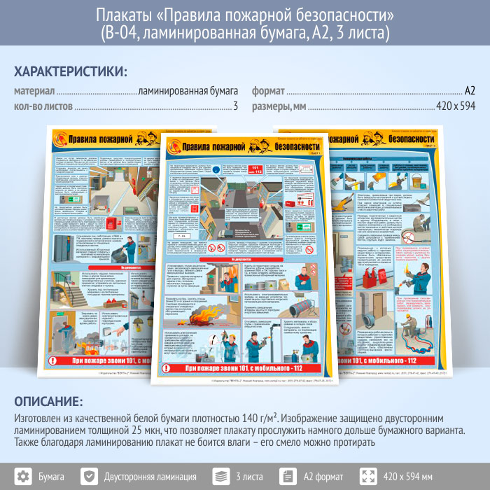 Плакаты «Правила пожарной безопасности» (В-04, ламинированная бумага, А2, 3 листа) в Москве купить