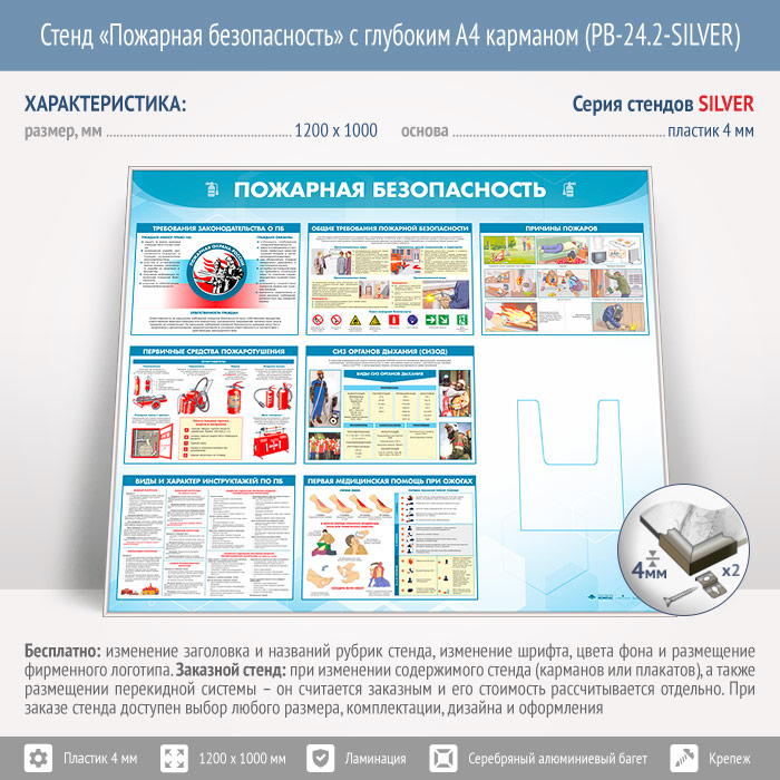 Стенд «Пожарная безопасность» с глубоким А4 карманом (PB-24.2-SILVER) в Москве купить