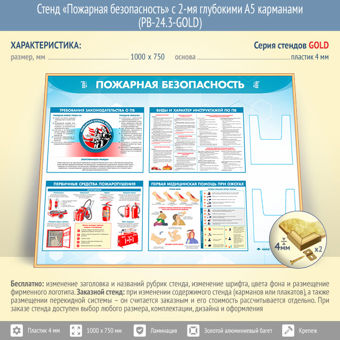 Стенд «Пожарная безопасность» с 2-мя глубокими А5 карманами (PB-24.3-GOLD) в Москве купить