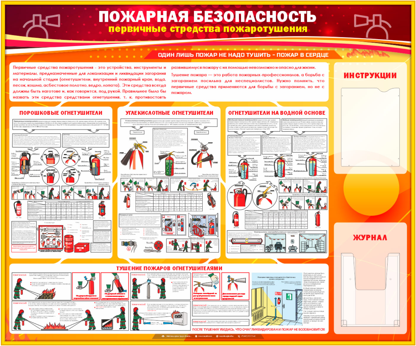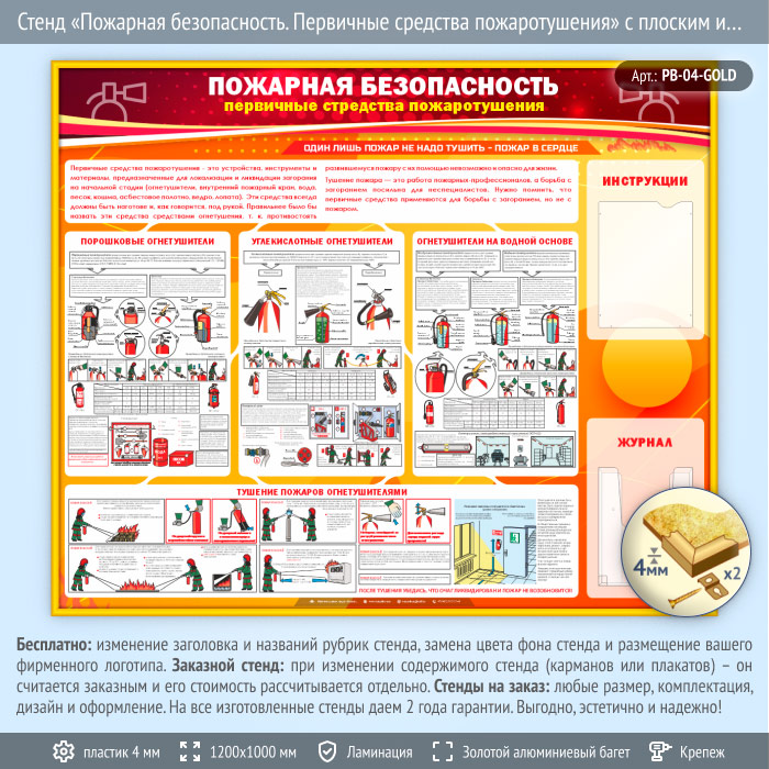 Стенд «Пожарная безопасность. Первичные средства пожаротушения» с плоским и объемным карманами (PB-04-GOLD) в Москве купить