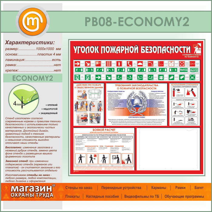 Стенд «Уголок пожарной безопасности» с карманом А3 формата (PB-08-ECONOMY2) в Москве купить