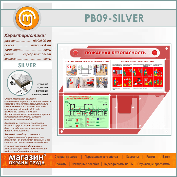 Стенд «Пожарная безопасность» с планом эвакуации, плоским и объемным карманами (PB-09-SILVER) в Москве купить