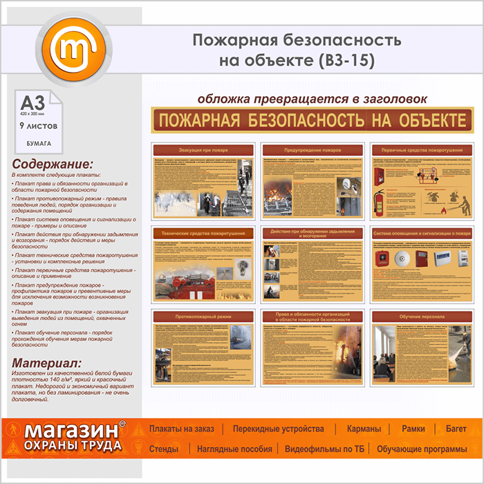 Плакаты «Пожарная безопасность на объекте» (ВЗ-15, бумага, А3, 10 листов) в Москве купить