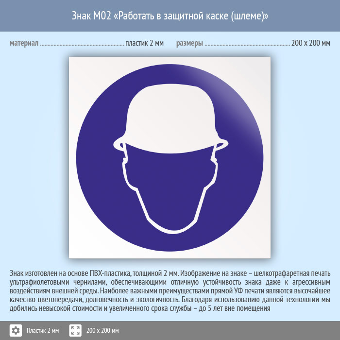 Знак M02 «Работать в защитной каске (шлеме)» (пластик, 200х200 мм) в Москве купить