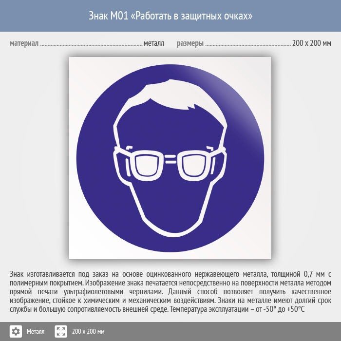Знак M01 «Работать в защитных очках» (металл, 200х200 мм) в Москве купить