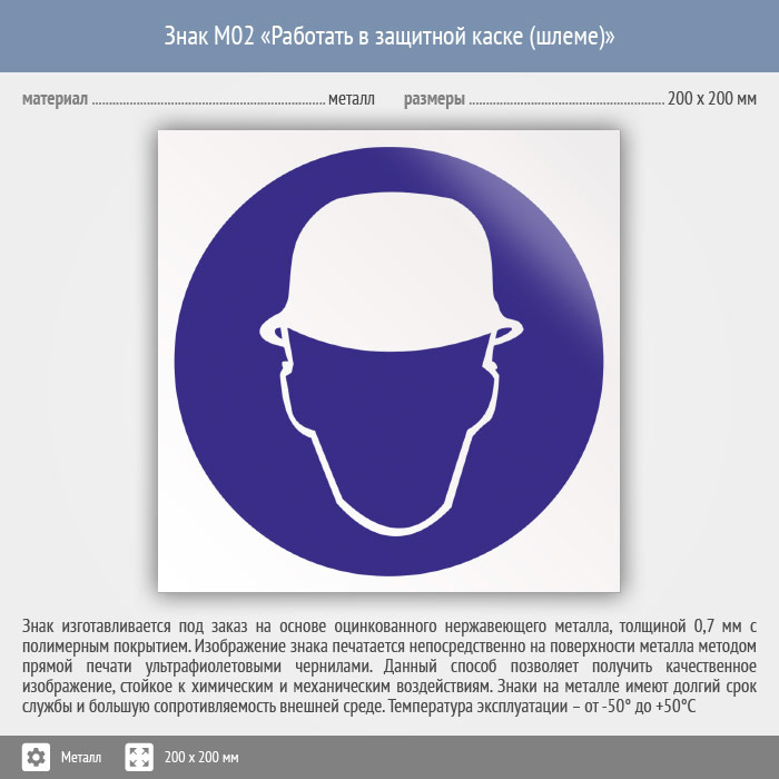 Знак M02 «Работать в защитной каске (шлеме)» (металл, 200х200 мм) в Москве купить