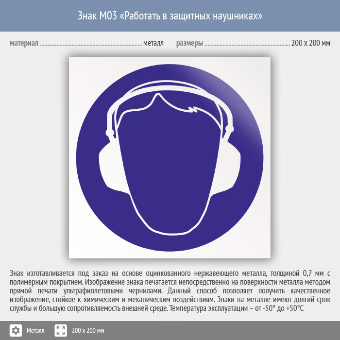 Знак M03 «Работать в защитных наушниках» (металл, 200х200 мм) в Москве купить