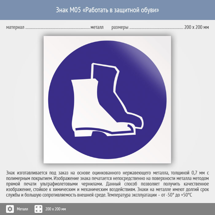 Знак M05 «Работать в защитной обуви» (металл, 200х200 мм) в Москве купить