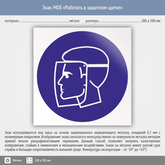Знак M08 «Работать в защитном щитке» (металл, 200х200 мм) в Москве купить