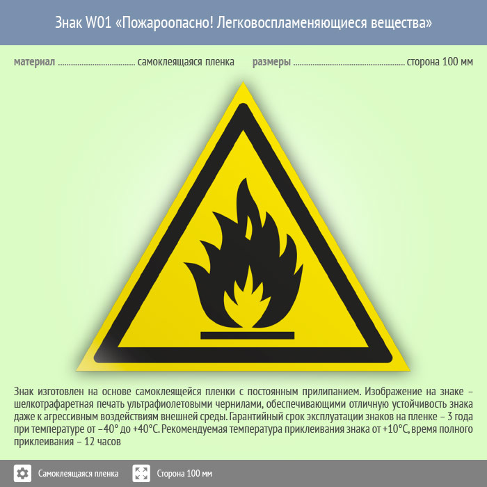 Знак W01 «Пожароопасно! легковоспламеняющиеся вещества» (пленка, сторона 100 мм) в Москве купить