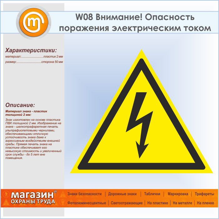 Знак W08 «Внимание! опасность поражения электрическим током» (пластик, сторона 50 мм) в Москве купить