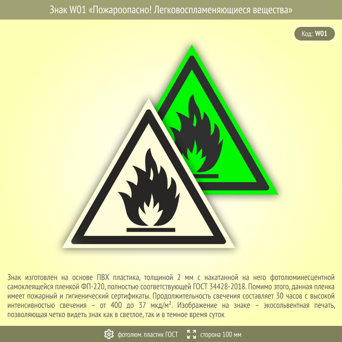 Знак W01 «Пожароопасно! Легковоспламеняющиеся вещества» (фотолюминесцентный пластик ГОСТ 34428-2018, сторона 100 мм) в Москве купить