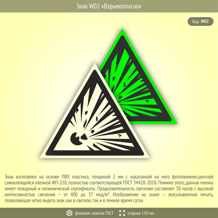 Знак W02 «Взрывоопасно» (фотолюминесцентный пластик ГОСТ 34428-2018, сторона 150 мм) в Москве купить