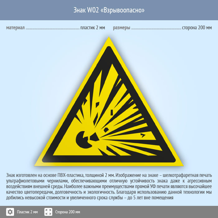 Знак W02 «Взрывоопасно» (пластик, сторона 200 мм) в Москве купить