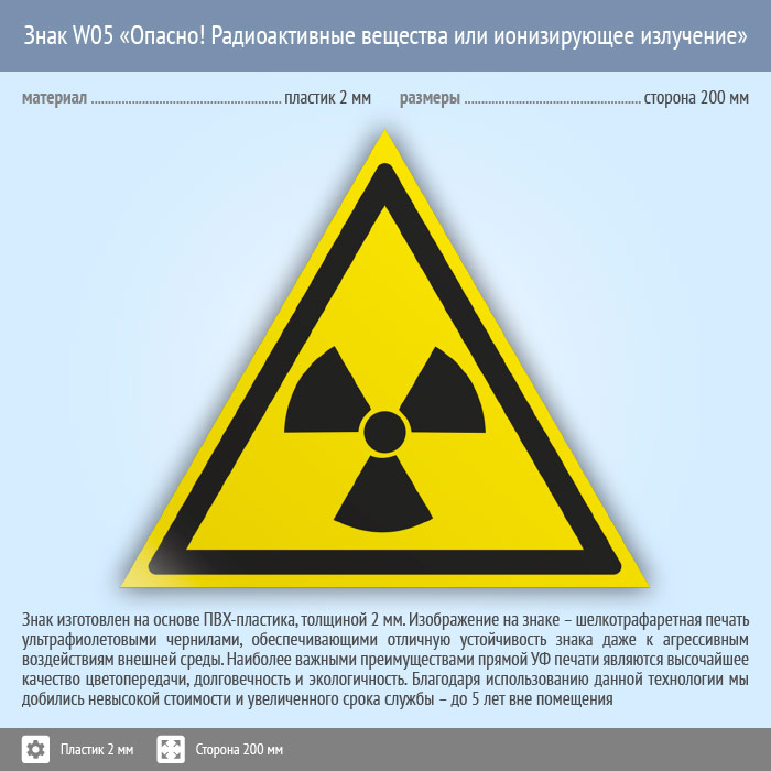 Знак W05 «Опасно! радиоактивные вещества или ионизирующее излучение» (пластик, сторона 200 мм) в Москве купить