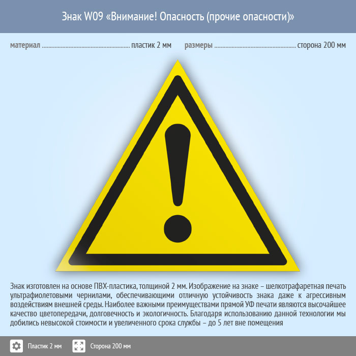 Знак W09 «Внимание! опасность (прочие опасности)» (пластик, сторона 200 мм) в Москве купить