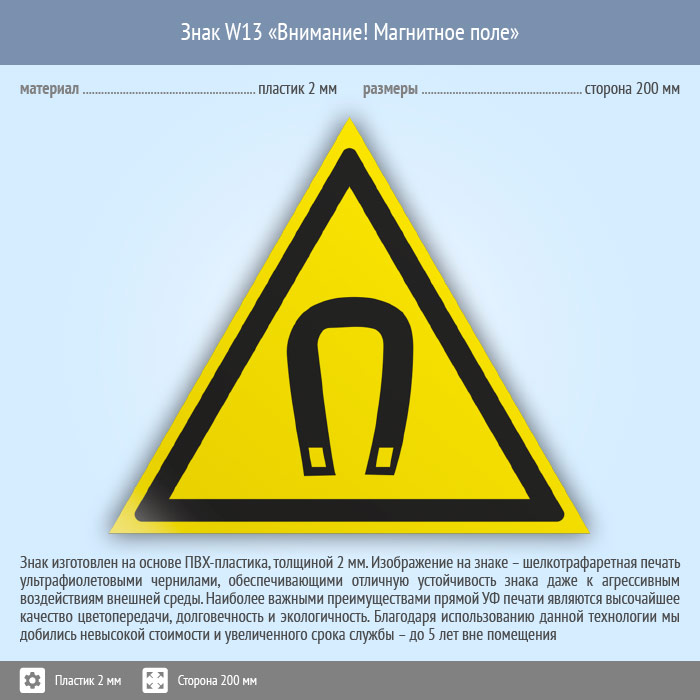 Знак W13 «Внимание! магнитное поле» (пластик, сторона 200 мм) в Москве купить