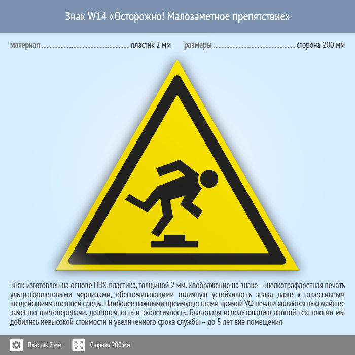 Знак W14 «Осторожно! малозаметное препятствие» (пластик, сторона 200 мм) в Москве купить