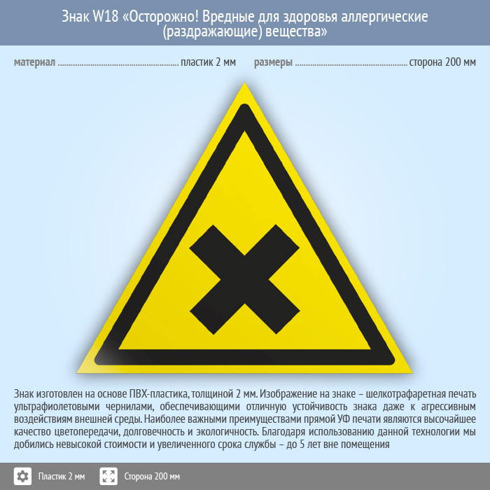 Знак W18 «Осторожно! вредные для здоровья аллергические (раздражающие) вещества» (пластик, сторона 200 мм) в Москве купить