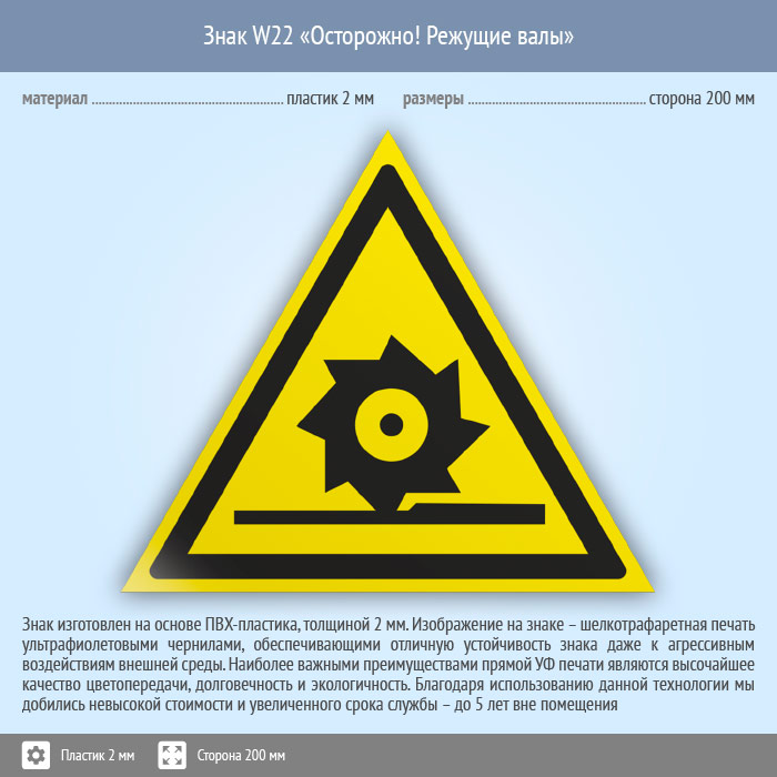 Знак W22 «Осторожно! режущие валы» (пластик, сторона 200 мм) в Москве купить