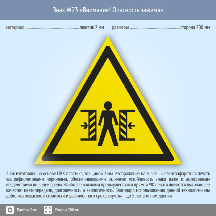 Знак W23 «Внимание! опасность зажима» (пластик, сторона 200 мм) в Москве купить