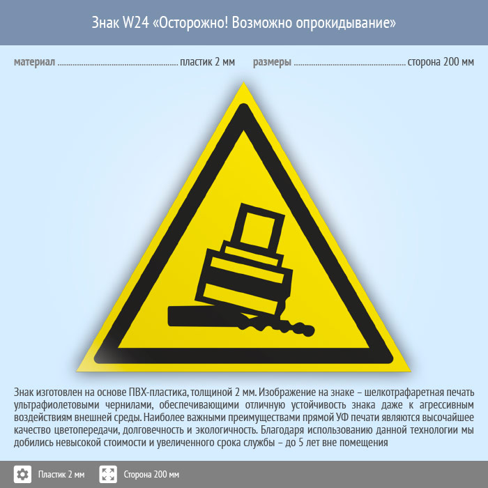 Знак W24 «Осторожно! возможно опрокидывание» (пластик, сторона 200 мм) в Москве купить