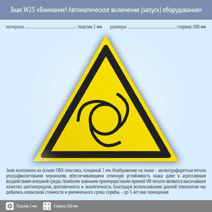Знак W25 «Внимание! автоматическое включение (запуск) оборудования» (пластик, сторона 200 мм) в Москве купить