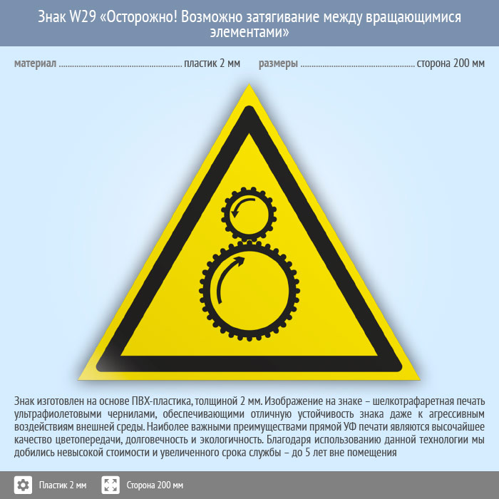 Знак W29 «Осторожно! возможно затягивание между вращающимися элементами» (пластик, сторона 200 мм) в Москве купить