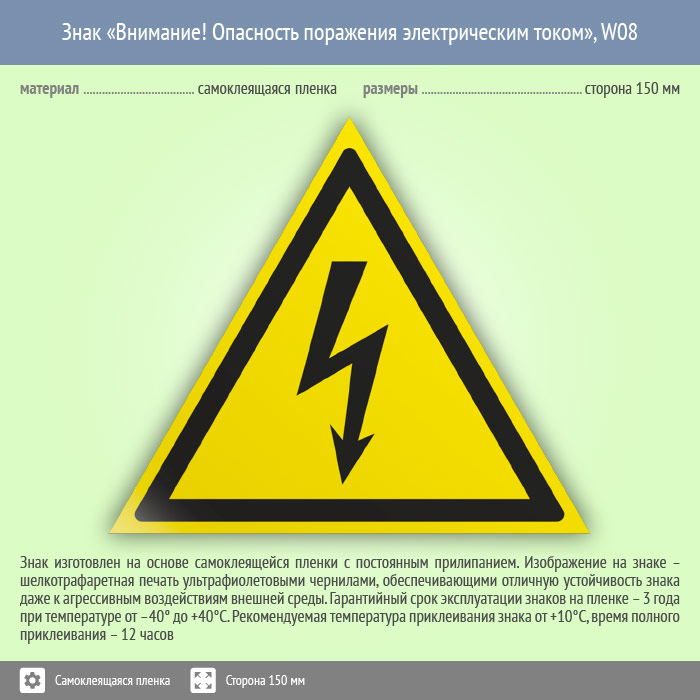 Знак W08 «Внимание! опасность поражения электрическим током» (пленка, сторона 150 мм) в Москве купить