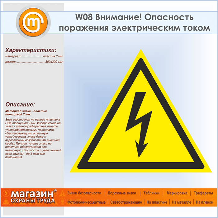 Знак W08 «Внимание! опасность поражения электрическим током» (пластик, сторона 300 мм) в Москве купить