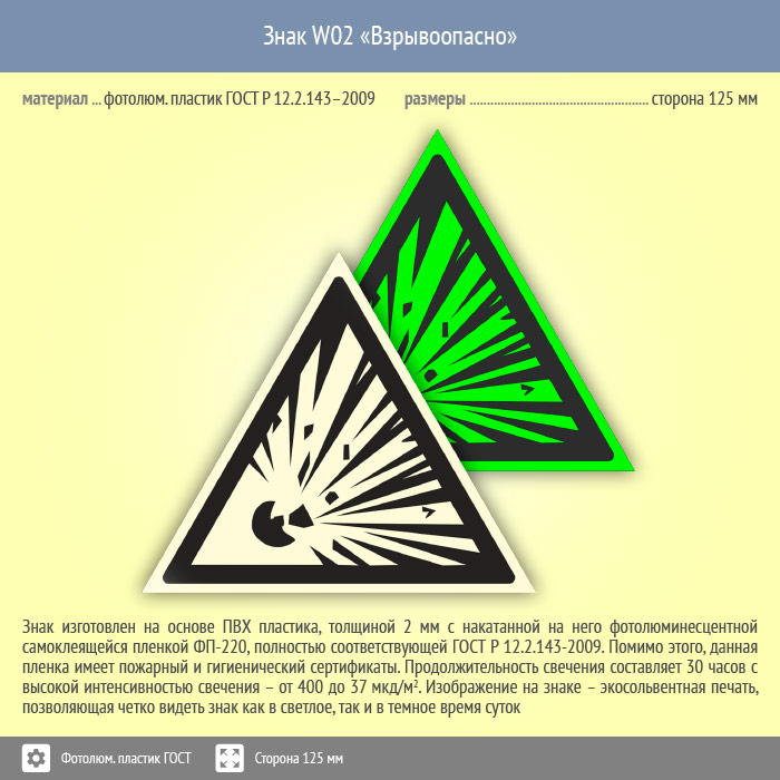 Знак W02 «Взрывоопасно» (фотолюминесцентный пластик ГОСТ 34428-2018, сторона 125 мм) в Москве купить