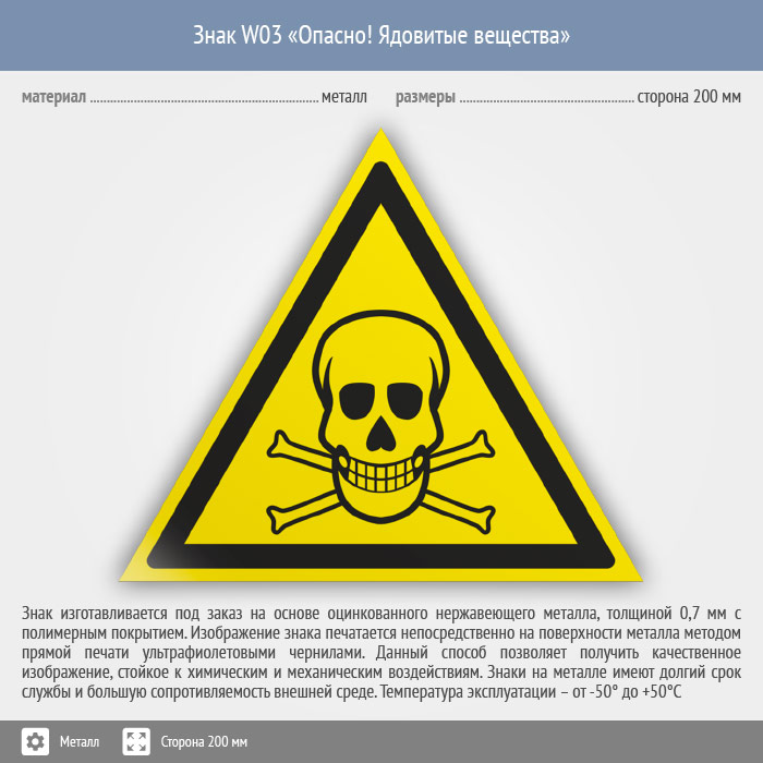 Знак W03 «Опасно! ядовитые вещества» (металл, сторона 200 мм) в Москве купить