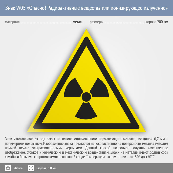 Знак W05 «Опасно! радиоактивные вещества или ионизирующее излучение» (металл, сторона 200 мм) в Москве купить