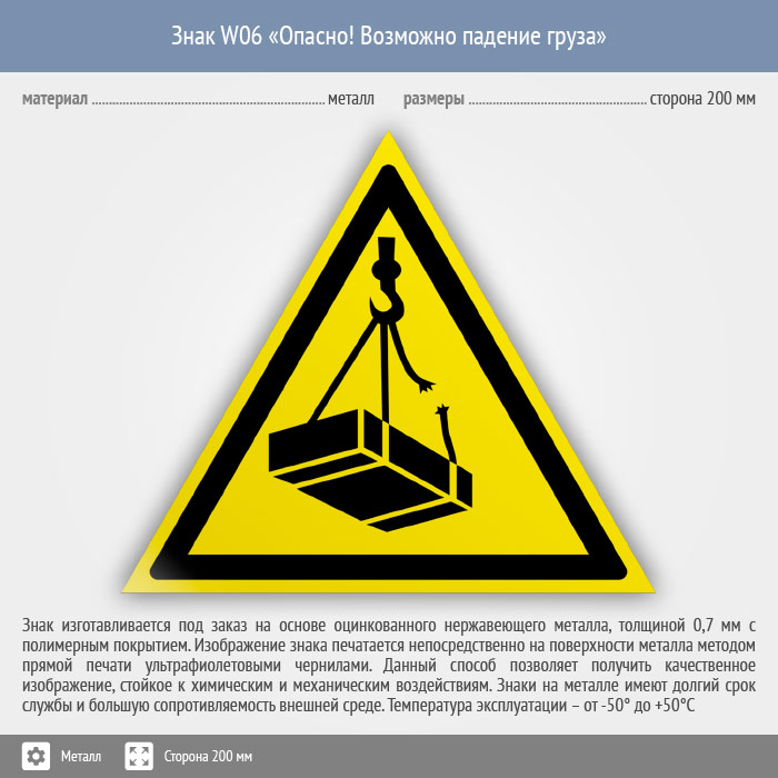 Знак W06 «Опасно! возможно падение груза» (металл, сторона 200 мм) в Москве купить