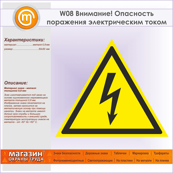 Знак W08 «Внимание! опасность поражения электрическим током» (металл, сторона 50 мм) в Москве купить