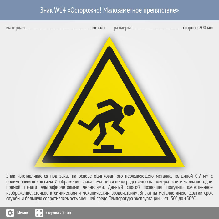 Знак W14 «Осторожно! малозаметное препятствие» (металл, сторона 200 мм) в Москве купить