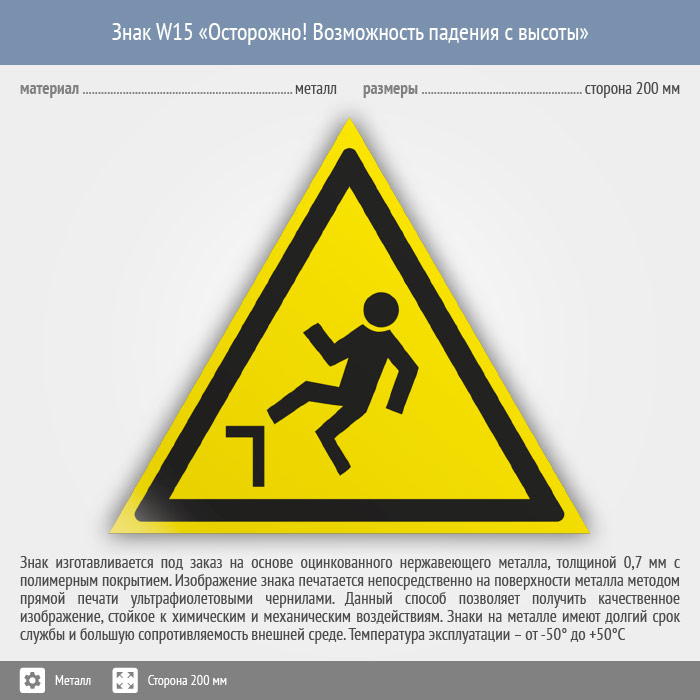 Знак W15 «Осторожно! возможность падения с высоты» (металл, сторона 200 мм) в Москве купить