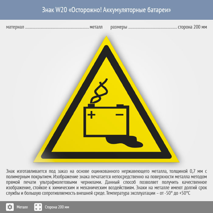 Знак W20 «Осторожно! аккумуляторные батареи» (металл, сторона 200 мм) в Москве купить