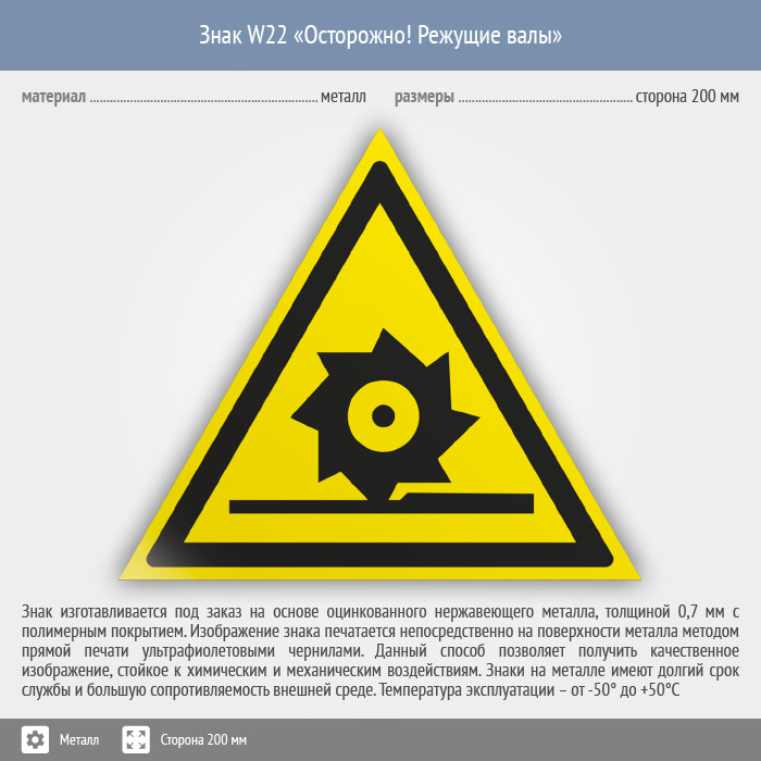 Знак W22 «Осторожно! режущие валы» (металл, сторона 200 мм) в Москве купить