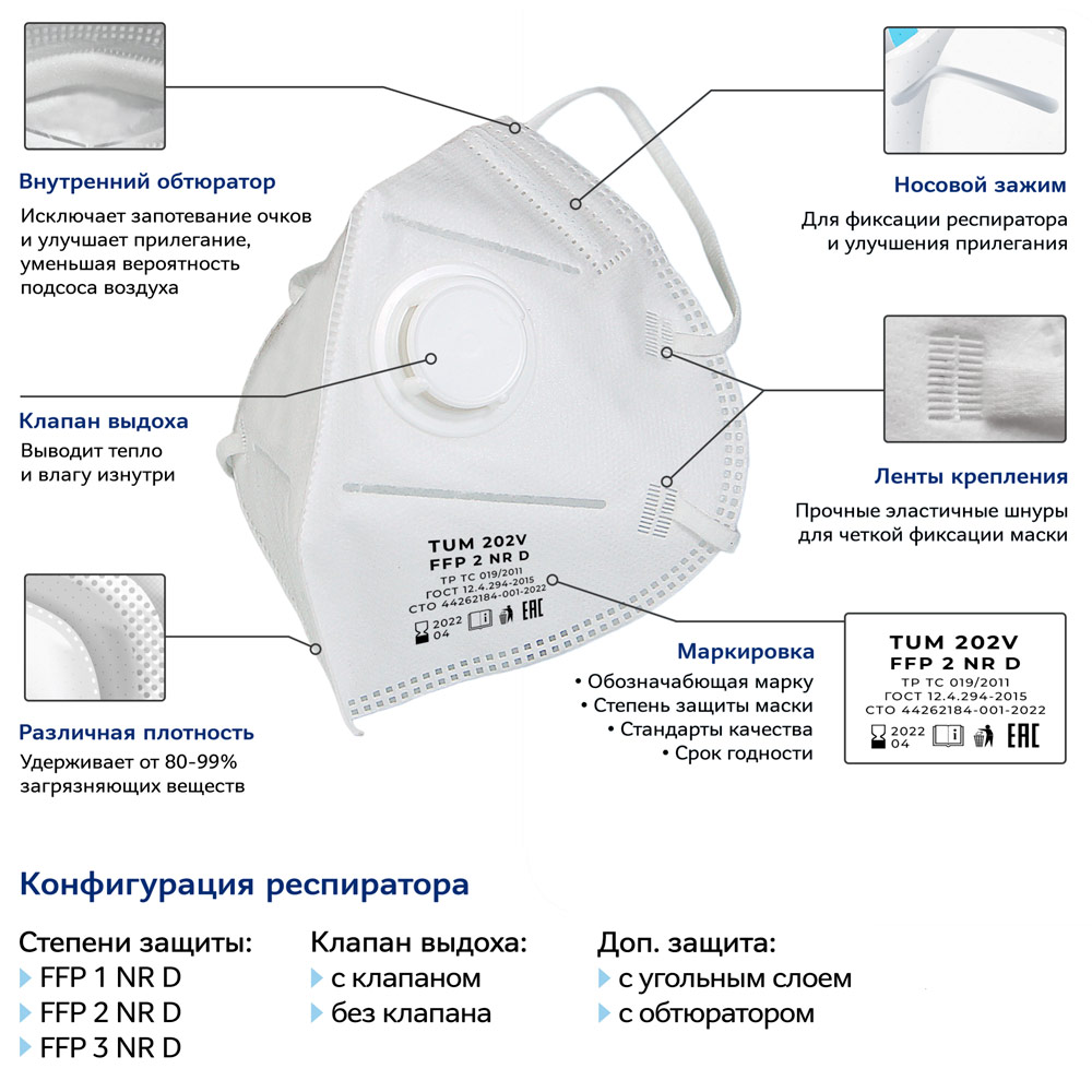 Респиратор противоаэрозольный TUM 302С (FFP3) с угольным слоем, к-т 10 шт в Москве купить