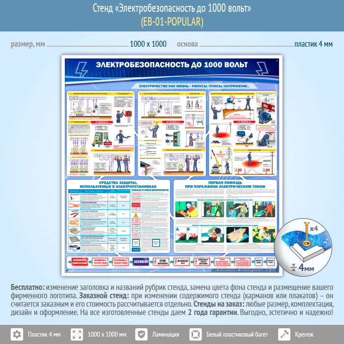 Стенд «Электробезопасность до 1000 вольт» содержит полную информацию об опасностях однофазных и двухфазных прикосновений, научит правильно переключать и заземлять электроустановки, напомнит о 3-х основных правилах перед началом работ. Приведен краткий перечень необходимых средств защиты – внешний вид, сроки эксплуатации и нормы испытаний, а также все необходимые знаки, используемые при работе с электрооборудованием. Стенд содержит информацию о первой помощи при поражении электрическим током – правила освобождения человека от действия тока и правила проведения искусственного дыхания и наружного массажа сердца