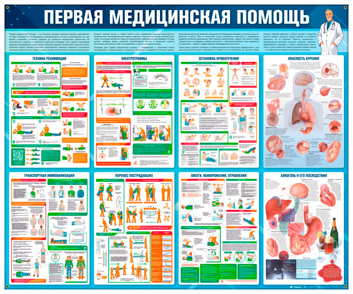 Стенд «Первая медицинская помощь» (PM-08) посвящён оказанию первой медицинской помощи в экстренных ситуациях и предназначен для размещения на предприятиях, в учебных заведениях, организациях с повышенным риском травматизма. На плакатах представлены основные алгоритмы действий при остановке дыхания и сердцебиения, кровотечении, ожогах, отравлениях, переохлаждении и других неотложных состояниях. Подробно показаны техника реанимации, приёмы транспортной иммобилизации и правила переноски пострадавших. Дополнительно раскрыты темы вреда курения и алкоголя для организма. Стенд помогает сформировать базовые навыки первой помощи и способствует сохранению жизни и здоровья до прибытия медиков.