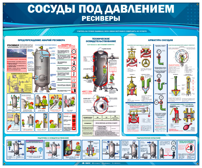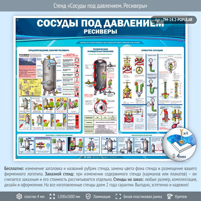 Стенд «Сосуды под давлением. Ресиверы» (TM-14.2) содержит информацию о предупреждении аварий ресивера, техническом освидетельствовании и арматуре сосудов.