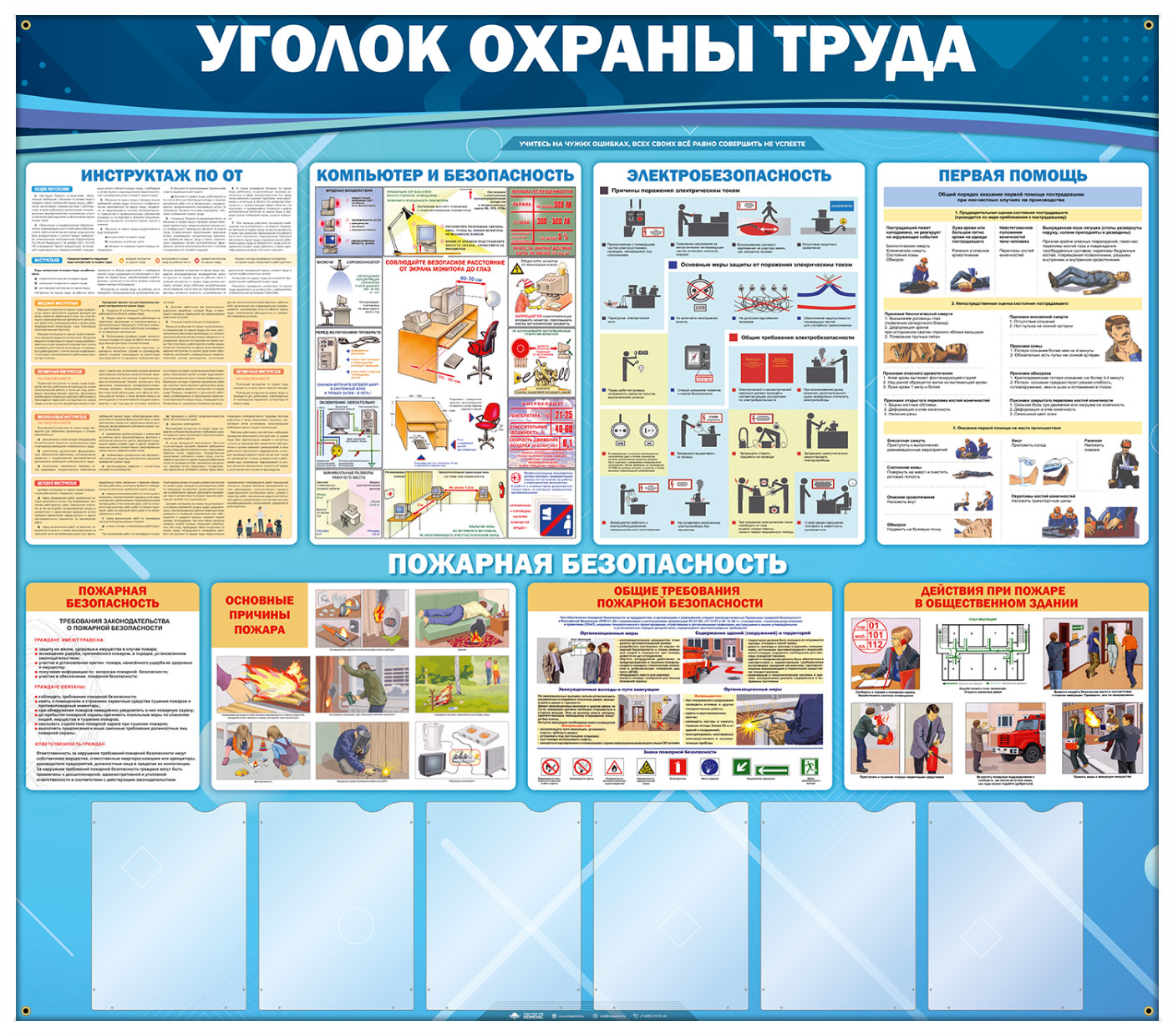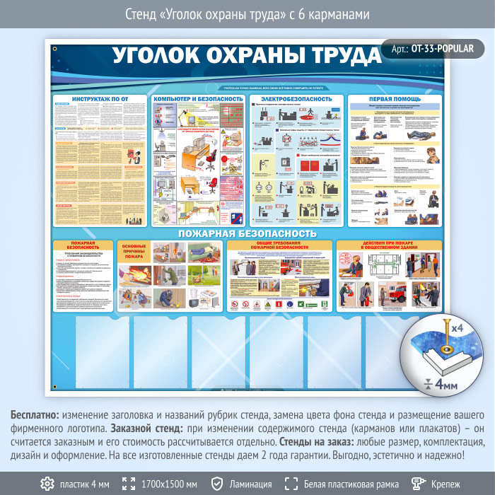 На стенде «Уголок охраны труда» размещена самая основная информация по инструктажу охраны труда, яркая и наглядная информация по компьютерной безопасности, основные правила по электробезопасности, техника оказания первой медицинской помощи и самая необходимая информация о пожарной безопасности. Также на стенде размещено 6 плоских А4 карманов для самостоятельного размещения информации