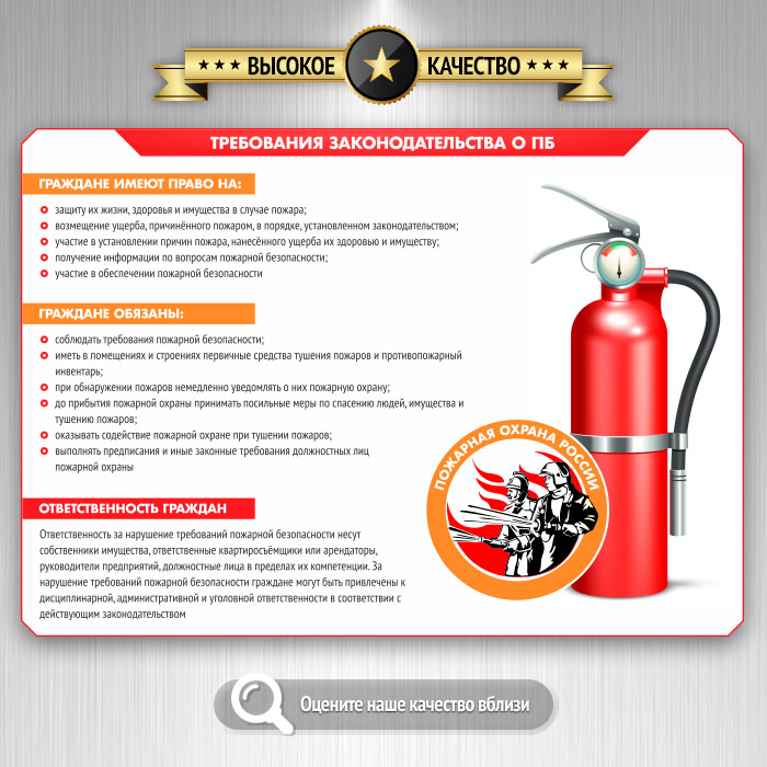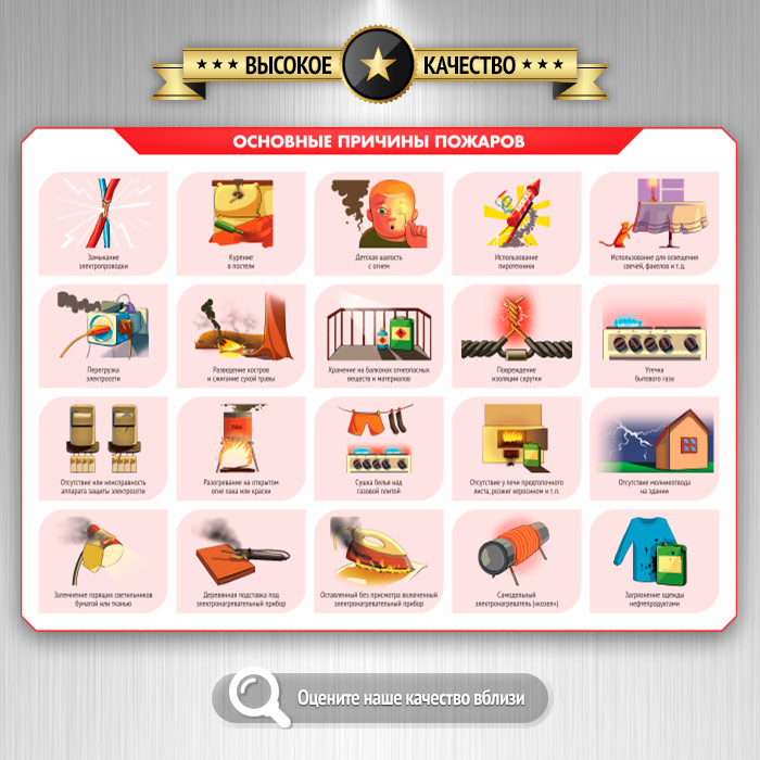 Стенд «Умей действовать при пожаре» содержит самые важные аспекты пожарной безопасности. Чисто теоретических плакатов здесь всего 2 - «Требования законодательства о ПБ» и «Противопожарный инструктаж». Все же остальные - максимально практичные и наглядно объясняют причины пожаров, как их не допустить и что делать, если пожар все же произошел. Также подробно освещена тема оказания первой помощи при ожогах разной степени тяжести. Как всегда, только актуальная информация, качественные иллюстрации и современный дизайн!